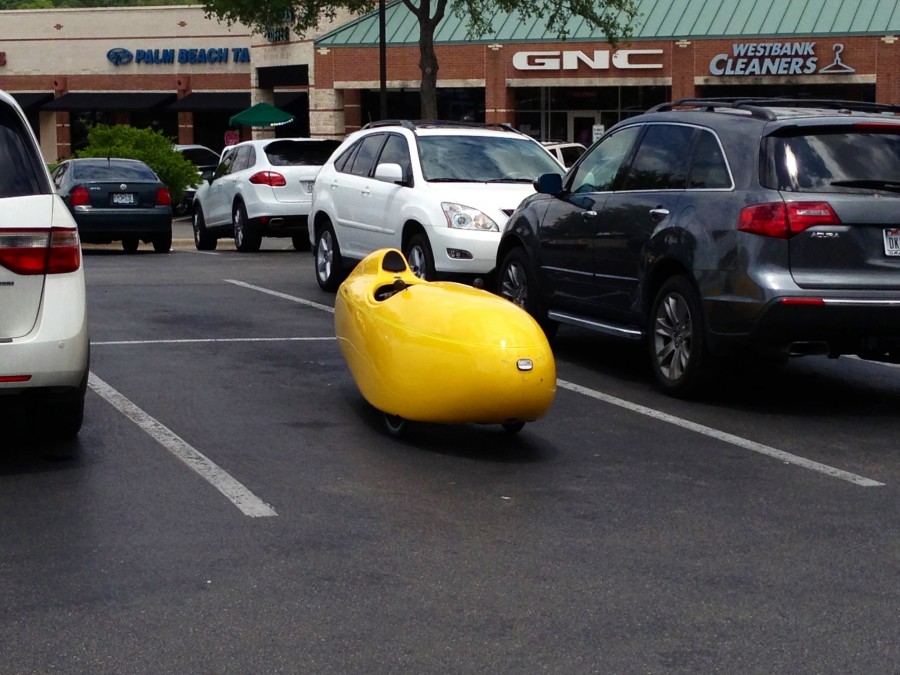 We have our unique Austinites like the guy who travels via a tiny yellow vehicle, which we call the banana mobile. He is often spotted on 360 near the Bee Caves exit and he happens to shop at that H-E-B. We doubt he can fit many groceries in his uniquely Austin vehicle, but it sure does make us smile when we see him on the road.